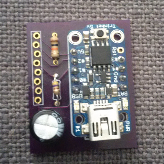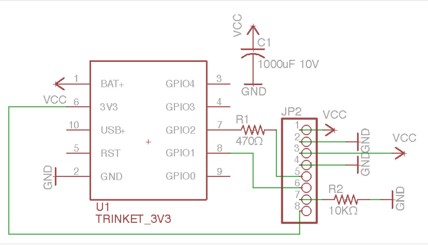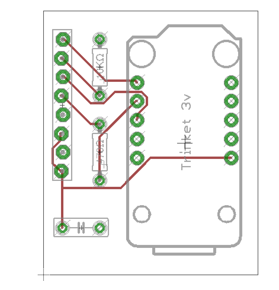 The first thing I did was watch a few videos and download the free version of EAGLE. I had the advantage of working with this circuit for a while and pretty much having it memorized. Once In EAGLE I created the schematic and board layout. From there it came down to printing and making though my pull though components would work as expected. I also used the Trinket EAGLE file found on GitHub.